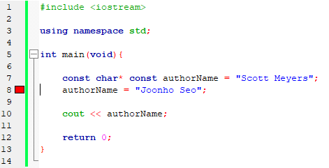 pointer(authorName)에까지 const를 걸어버리면 위와 같은 코드는 에러가 뜬다.