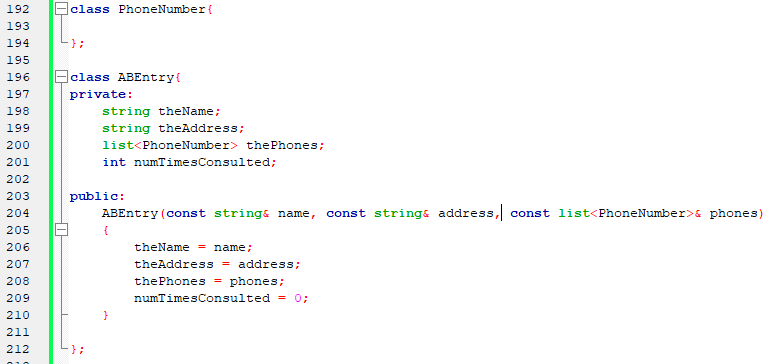 위는 대입문, 아래는 맴버 초기화 리스트를 사용하였다. 맴버에 사용자가 원하는 값을 주고 시작한다는 점은 똑같지만, 앞의 대입을 사용한 생성자보다 효율이 좋은 이유는 대입버전의 경우는 theName, theAddress, thePhones가 각각의 type에 대한 기본생성자를 호출해 미리 초기화가 된 상태에서 대입으로 새로운 값을 넣는 것이다. 즉 초기화 => 대입 두가지 공정이 들어감, 이로 인해 초기화도 의미없는 짓이 됨