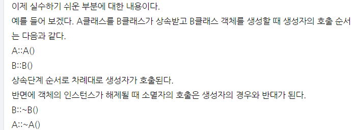 소멸자가 동작하는 순서 : 상속 계통 구조에서 가장 말단의 derived class의 소멸자 -> 다음 소멸자 -> .. base class 소멸자