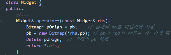 특히 pb = new Bitmap(*rhs.pb); 여기서 예외가 터지면(동적 할당에 필요한 메모리가 부족하다던지, Bitmap 클래스의 복사 생성자에서 예외를 던지던지) Widget 객체는 삭제된 Bitmap을 가르키는 dangling pointer가 될 가능성이 있다.