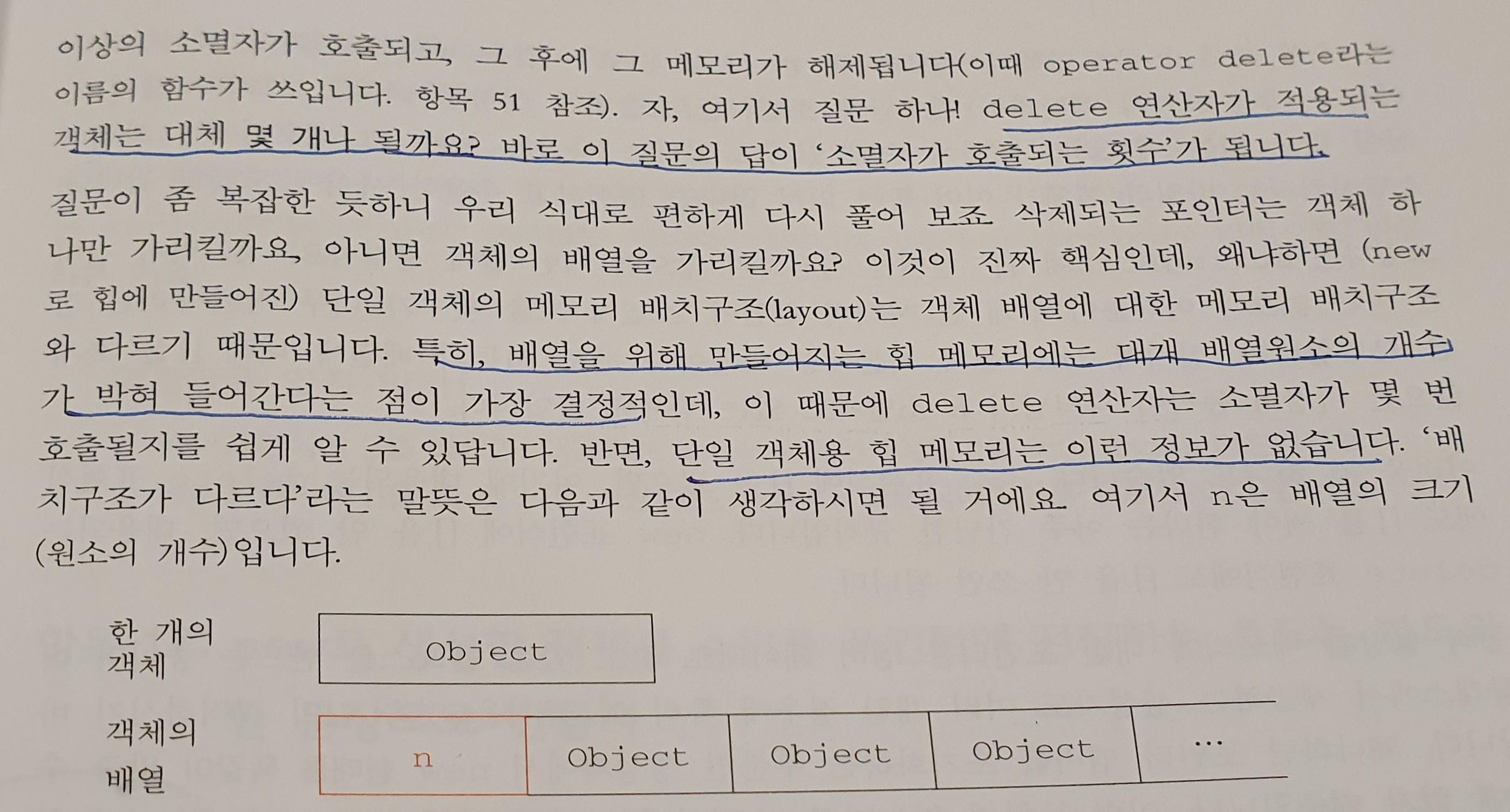밑의 그림이 핵심이다. new로 만들어진 단일 객체와 new로 만들어진 객체 배열이 좀 다르기 때문이다. 객체 배열을 동적 할당하면 배열 맨 앞에 배열의 길이가 들어간다. 반면 단일 객체용 힙 메모리에는 이런 정보가 없다.