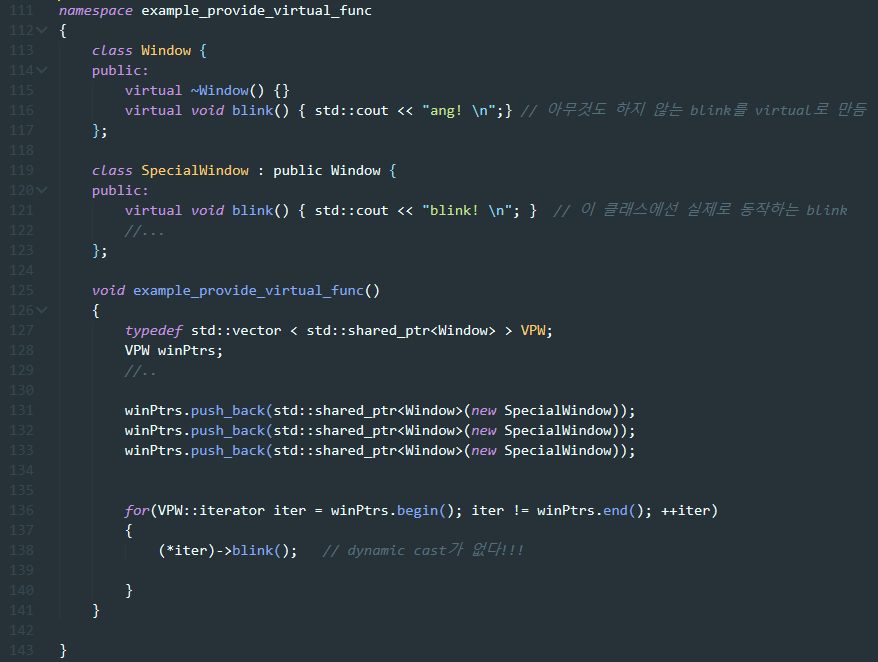 wrong_example의 if 문장이 왜 되는지 설명하자면, C++에선 어떤 맴버함수에 참조할 때, 실제 객체가 아니라 타입 이름가지고 판단함. 그래서 psw가 가르키는 객체는 Window 이지만, 타입이 SpecialWindow이기 때문에 SpeicalWindow의 blink()를 실행시킴.