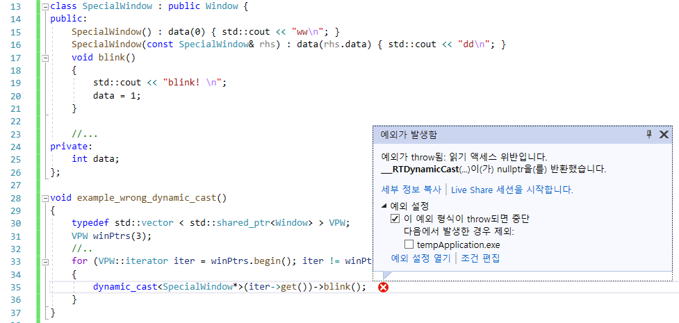 하지만 우리가 사실 dynamic_cast를 쓰고 싶었던 이유는, Window에서 파생되는 많은 클래스들을 전부 기본 클래스 인터페이스를 통해 조작하고 싶기 때문일 것이다. 그냥 SpecialWindow의 포인터를 사용하면 cast는 안해도 되지만, VPSW로 Window의 다른 자손들은 조작할 수 없다.
