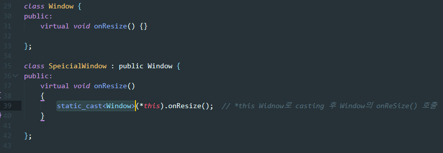 ? => *this를 cast 함 => *this의 기본 클래스에 대한 Copy가 만들어짐!!! -> 임시 Copy의 onResize()를 호출 => logical error!!!