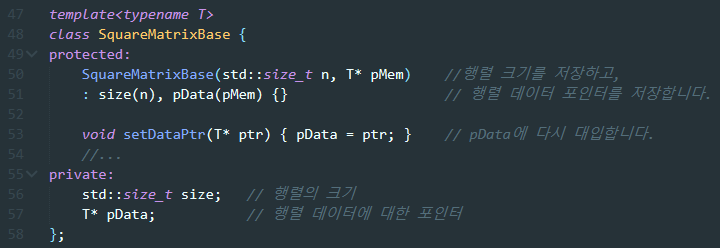 다른 방법을 알아보자. 행렬 데이터가 있는 메모리에 대한 포인터를 SquareMatrixBase가 저장하게 하는 것이다. 그리고 포인터를 저장하는 김에 행렬 크기도 저장하자. 결과적으로는 다음과 같은 설계가 나올 것이다.