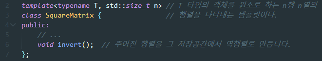 예제를 보자. 고정 크기의 정방행렬을 나타내는 클래스 템플릿을 하나 만들고 싶다고 가정하자. 이 클래스 템플릿은 역행렬 만들기 연산을 지원한다.