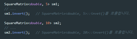 따라서 같은 타입의 객체를 원소로 같는 모든 정방행렬은 오직 한 가지의 SquareMatrixBase 클래스를 공유하게 된다. 즉, 같은 원소 타입의 정방행렬이 사용하는 기본 클래스 버전의 invert()도 오직 하나의 사본이라는 말이다. (위의 예제에서 원소 타입은 double로 같았지만 함수 사본이 2개가 된 것과는 대조적이다.)