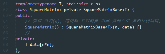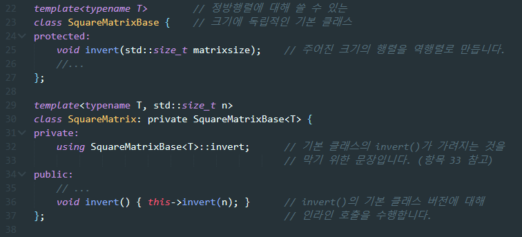 SquareMatrixBase와 SquareMatrix 사이의 상속 관계가 private인 점도 놓치지 말자. 이는 단순히 SquareMatrixBase가 SquareMatrix의 구현을 돕기 위한 것 외엔 아무 의미가 없기 때문이다.(private 상속은 is-implemented-in-terms-of 관계이다. 항목 39 참고)