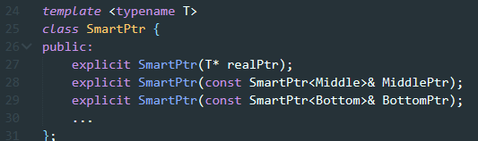 위 코드를 보면, 전부 같은 템플릿(SmartPtr)으로 만들어진 인스턴스들인데, 이들 사이에는 어떤 관계도 없기 때문에 컴파일러 입장에서 보면 SmartPtr<Top>과 SmartPtr<Middle>은 완벽히 별개의 클래스이다.