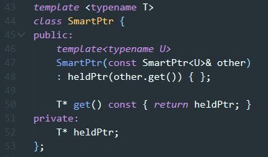 멤버 초기화 리스트를 사용해서, T* heldPtr = other.get(); 처럼 초기화하였다. 즉 T*과 U*의 암시적 변환이 일어났는데 T*<->U*은 기본제공 포인터의 변환이므로 타입 변환 제약이 걸린다.